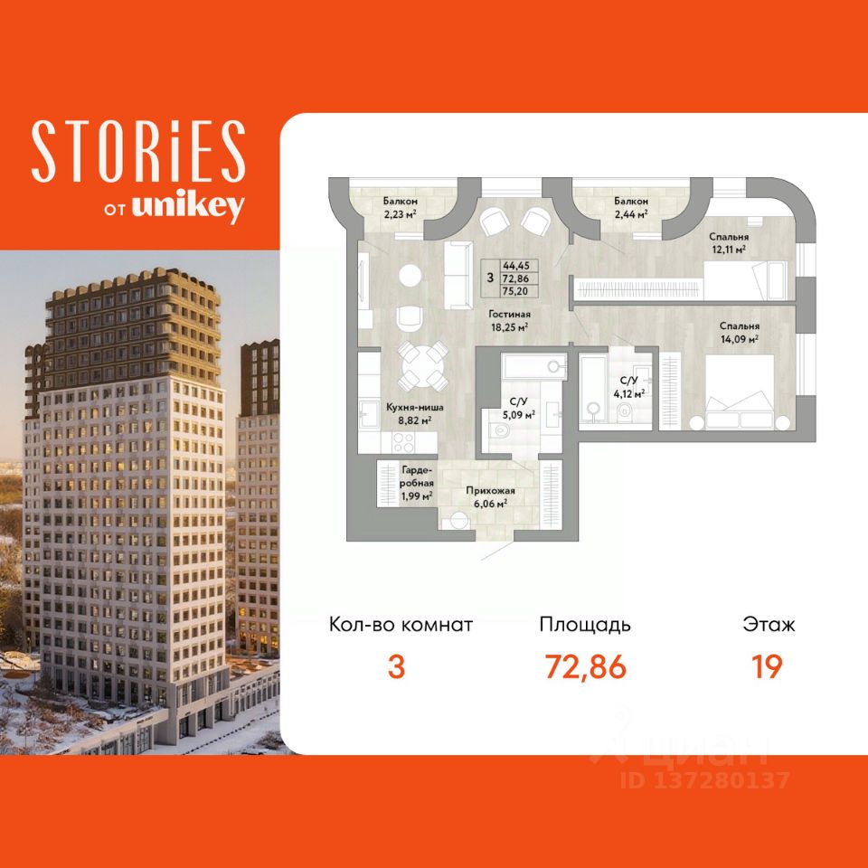 Просторная 3-комн. квартира с европланировкой и предчистовой отделкой в ЖК "Stories" на 19 этаже. Общая площадь: 72.86 кв.м., жилая: 44.45 кв.м., суммарная площадь гостиной-столовой с кухонной зоной: 27.07 кв.м. Европейская планировка, кухня-гостиная - идеальный вариант для тех, кто любит часто принимать гостей. Квартира угловая, очень светлая, естественная вентиляция при открытии окон. В квартире две лоджии, два совмещенных санузла. Высота потолков 2.9 м.