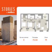Просторная трехкомнатная квартира с европланировкой и предчистовой отделкой в ЖК "Stories" на 19 этаже. Общая площадь: 72.34 кв.м., жилая: 43.66 кв.м., суммарная площадь гостиной-столовой с кухонной зоной: 27.84 кв.м. Европланировка, кухня и гостиная объединены в одно просторное помещение. Комнаты изолированные, все окна выходят на одну сторону. В квартире одна лоджия, два совмещенных санузла. Высота потолков 2.9 м.