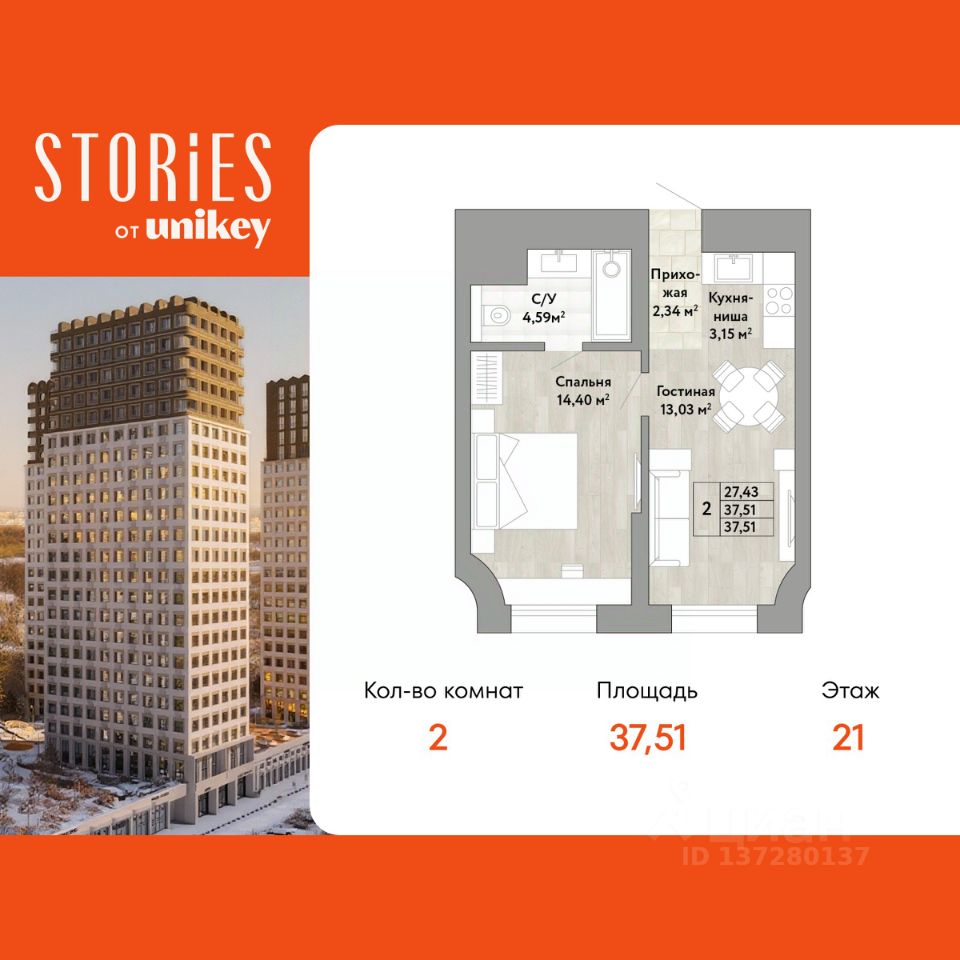 2-комн. квартира с европланировкой и предчистовой отделкой в ЖК "Stories" на 21 этаже. Общая площадь: 37.51 кв.м., жилая: 27.43 кв.м., общая площадь гостиной-столовой с кухонной зоной: 16.18 кв.м. Европейская планировка, зона гостиной комнаты объединена с кухней. Комнаты изолированные, все окна выходят на одну сторону. В квартире один совмещенный санузел. Высота потолков 2.9 м.