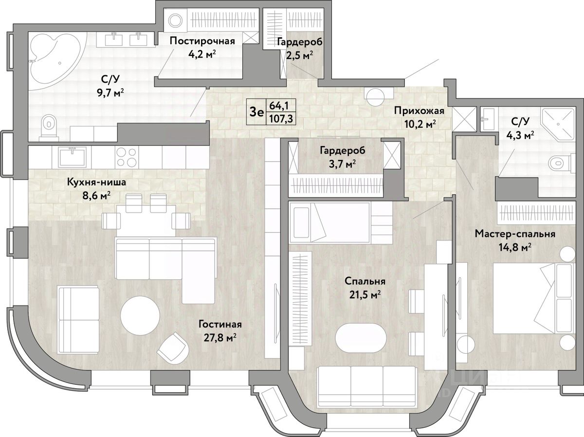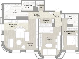 3-комн. квартира от застройщика в ЖК "Сердце Бонивура" на 8 этаже. Общая площадь: 107.3 кв.м. Высота потолков 2.85 м.