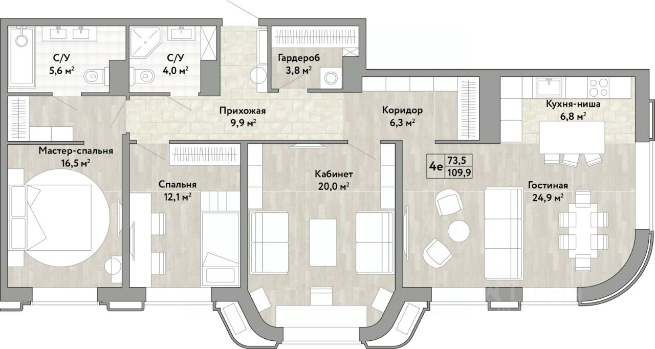 Четырехкомнатная квартира в ЖК "Сердце Бонивура" на 8 этаже. Общая площадь: 109.9 кв.м. Высота потолков 2.85 м.