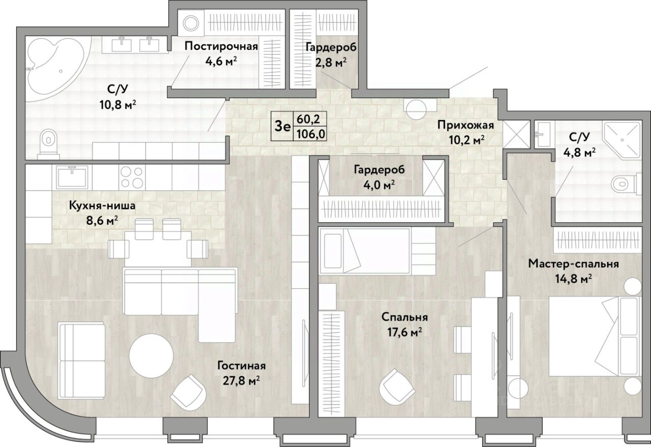3-комн. квартира в ЖК "Сердце Бонивура" на 2 этаже. Общая площадь: 106 кв.м. Высота потолков 2.85 м.