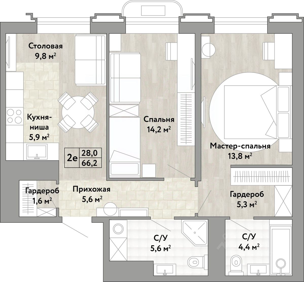 Двухкомнатная квартира в ЖК "Сердце Бонивура" на 13 этаже. Общая площадь: 66.2 кв.м. Высота потолков 2.85 м.