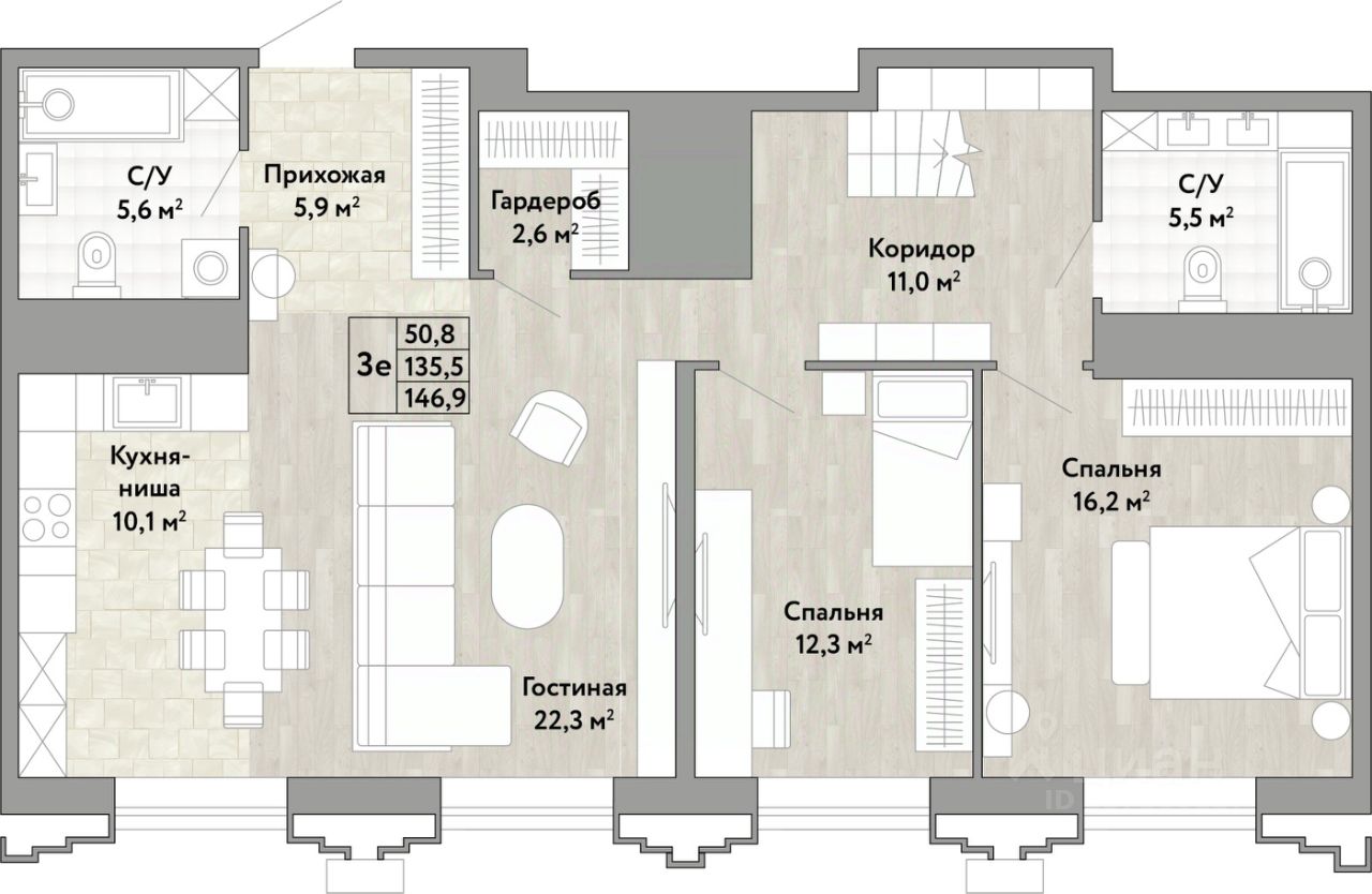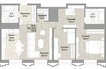 Трехкомнатная квартира в ЖК "Сердце Бонивура" на 20 этаже. Общая площадь: 146.9 кв.м. Высота потолков 2.85 м.