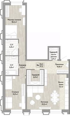 3-комн. квартира в ЖК "Сердце Бонивура" на 2 этаже. Общая площадь: 97.3 кв.м. Высота потолков 2.85 м.