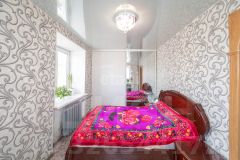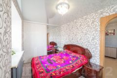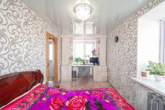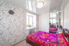 Дальняя комната с двумя окнами, очень светлая, теплая. В ней полностью выровнены стены и пол, натяжной потолок, вся отделка выполнена в светлых тонах. Умело спроектированное пространство позволило установить вместительную гардеробную.