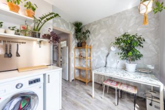 На стенах обои нейтральных оттенков, на полу ламинат, сан узел в кафеле.