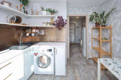 На стенах обои нейтральных оттенков, на полу ламинат, сан узел в кафеле.
