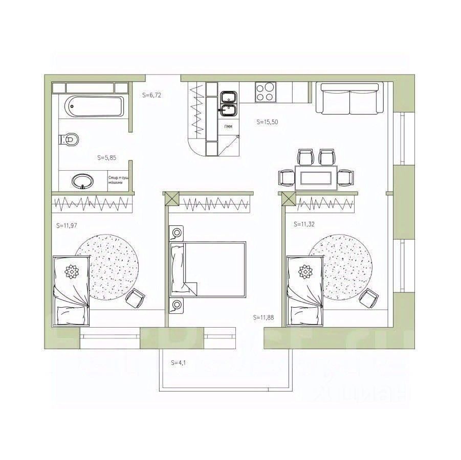 • Формат: Евро-3 (кухня-столовая + 2 комнаты). Свободная планировка.