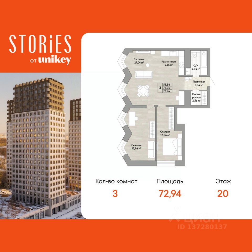 3-комн. квартира с европланировкой и предчистовой отделкой в ЖК "Stories" на 20 этаже. Общая площадь: 72.94 кв.м., жилая: 55.84 кв.м., общая площадь гостиной-столовой с кухонной зоной: 33.4 кв.м. Европланировка, кухня-гостиная - идеальный вариант для тех, кто любит часто принимать гостей. Квартира угловая, очень светлая, естественная вентиляция при открытии окон. В квартире один совмещенный санузел. Высота потолков 2.9 м.