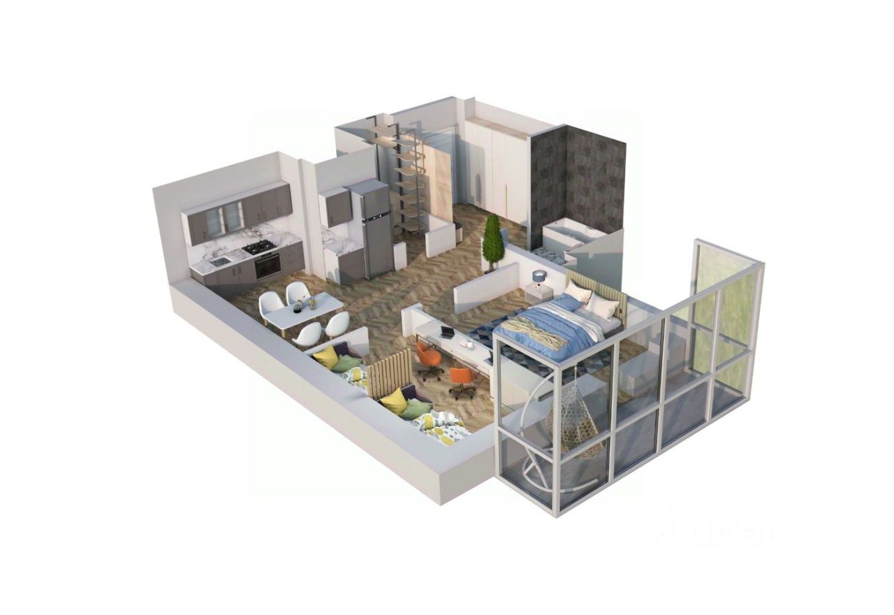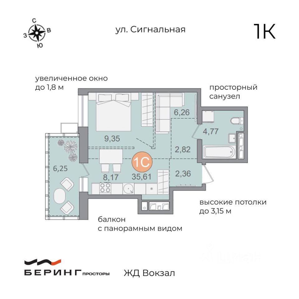 Просторная 1-комнатная квартира 42 м². Здесь спальня, кухня, комфортный санузел и большой балкон с панорамным видом, его можно оборудовать под рабочее место или зону отдыха.