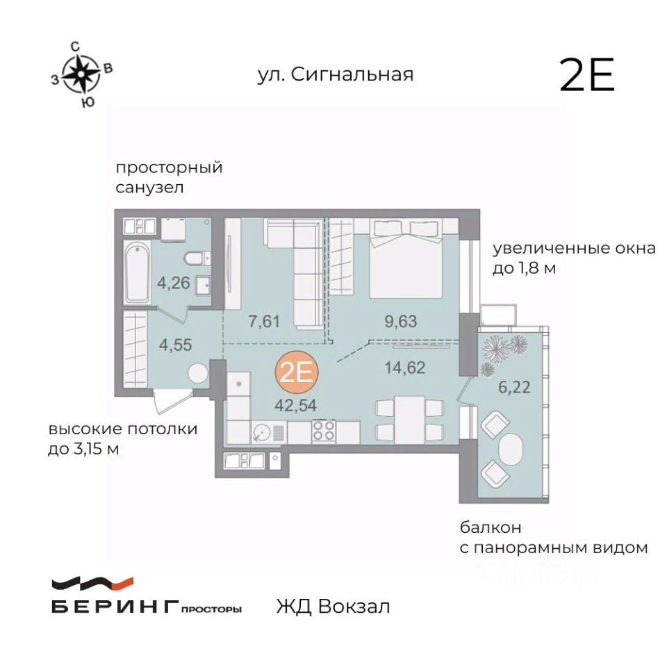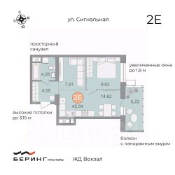 Светлая и комфортная евродвушка 42 м². Здесь спальня, просторная кухня-гостиная, санузел и балкон с панорамным видом, который можно оборудовать как зону отдыха или рабочее место.