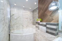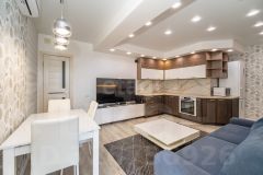 - Качественный фирменный ламинат, керамогранит, каменные столешницы на кухне и в ванной.