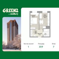 Продается однокомнатная квартира в ЖК "Green 2" на 7 этаже. Общая площадь: 37.9 кв.м. Высота потолков 2.7 м.