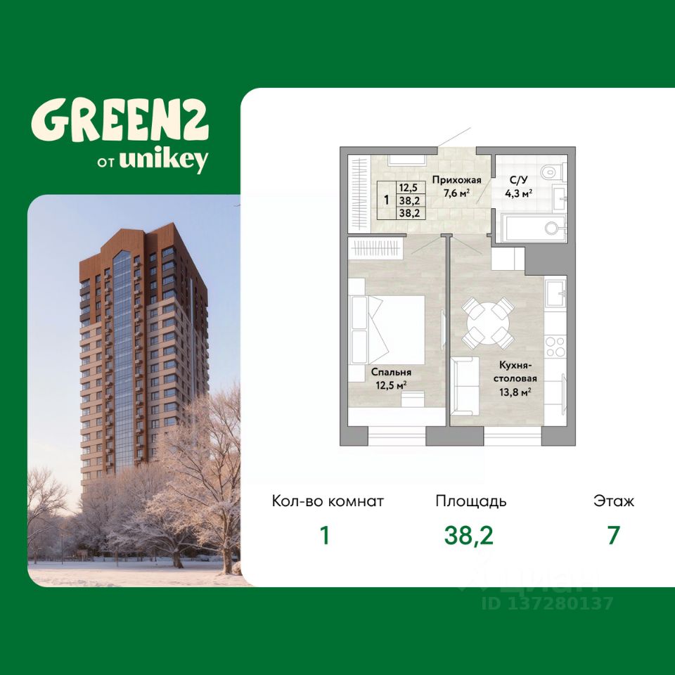 Продается 1-комн. квартира в ЖК "Green 2" на 7 этаже. Общая площадь: 38.2 кв.м. Высота потолков 2.7 м.