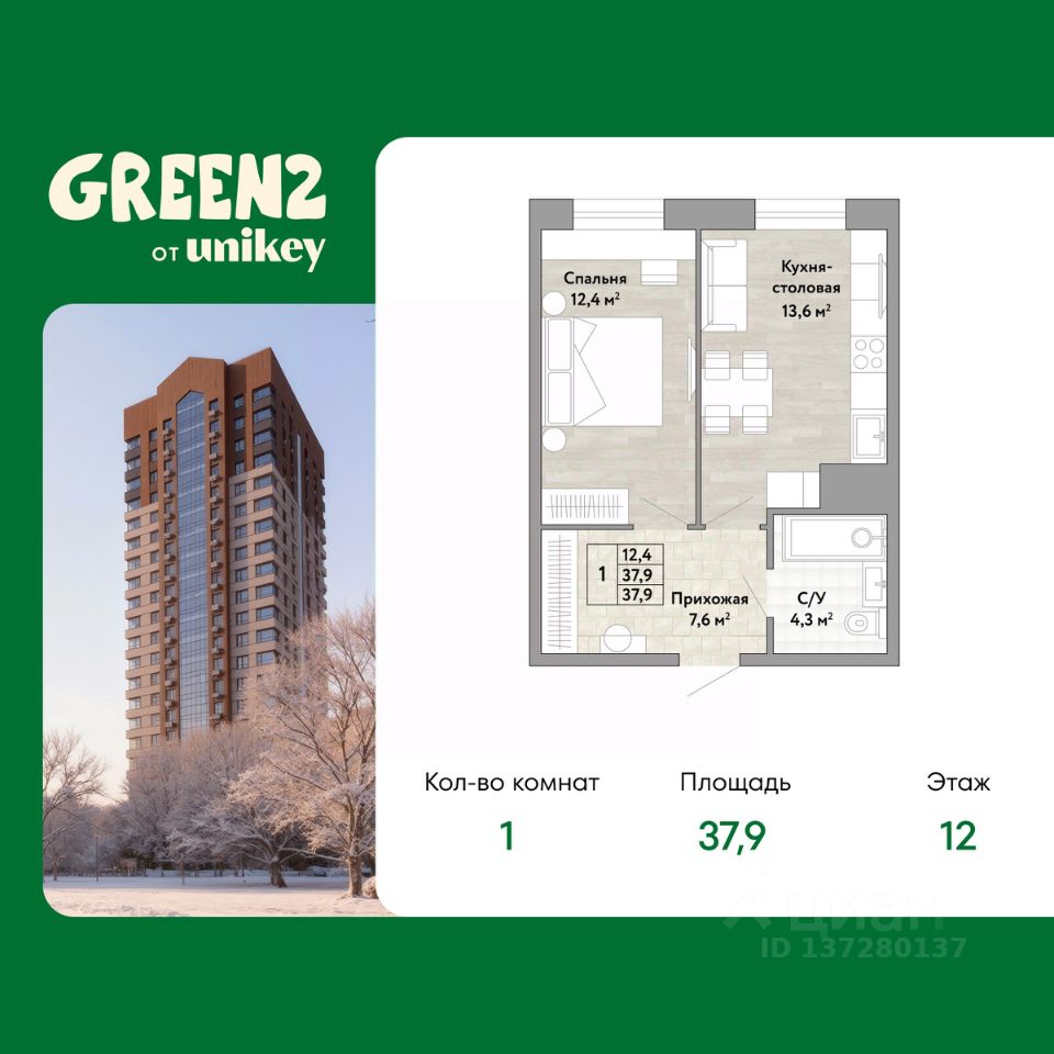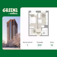 Однокомнатная квартира в ЖК "Green 2" на 12 этаже. Общая площадь: 37.9 кв.м. Высота потолков 2.7 м.