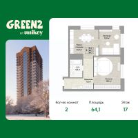 2-комн. квартира в ЖК "Green 2" на 17 этаже. Общая площадь: 64.1 кв.м. Высота потолков 2.7 м.