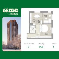 Двухкомнатная квартира от застройщика в ЖК "Green 2" на 5 этаже. Общая площадь: 64.8 кв.м. Высота потолков 2.7 м.