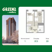 Продается 1-комн. квартира в ЖК "Green 2" на 20 этаже. Общая площадь: 37.3 кв.м. Высота потолков 2.7 м.
