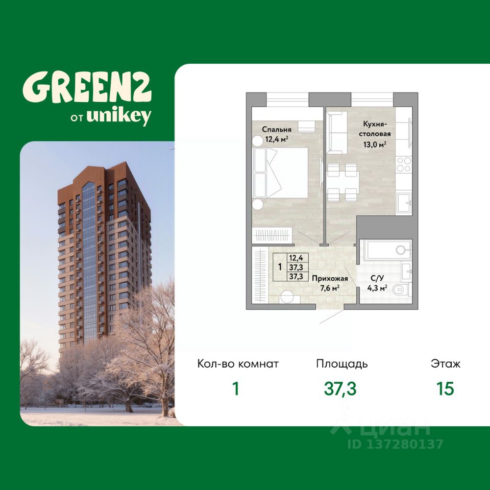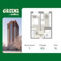 1-комн. квартира от застройщика в ЖК "Green 2" на 15 этаже. Общая площадь: 37.3 кв.м. Высота потолков 2.7 м.