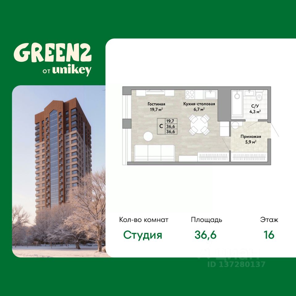 Просторная однокомнатная квартира в ЖК "Green 2" на 16 этаже. Общая площадь: 36.6 кв.м. Высота потолков 2.7 м.
