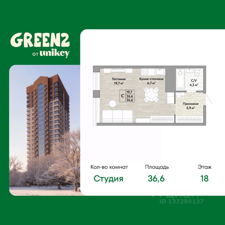Продается 1-комн. квартира от застройщика в ЖК "Green 2" на 18 этаже. Общая площадь: 36.6 кв.м. Высота потолков 2.7 м.