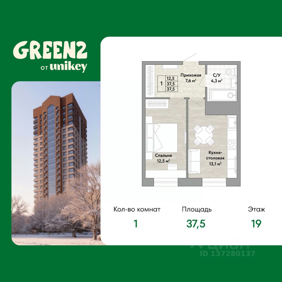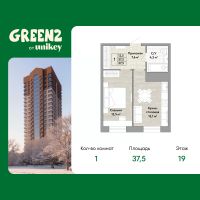 1-комн. квартира от застройщика в ЖК "Green 2" на 19 этаже. Общая площадь: 37.5 кв.м. Высота потолков 2.7 м.