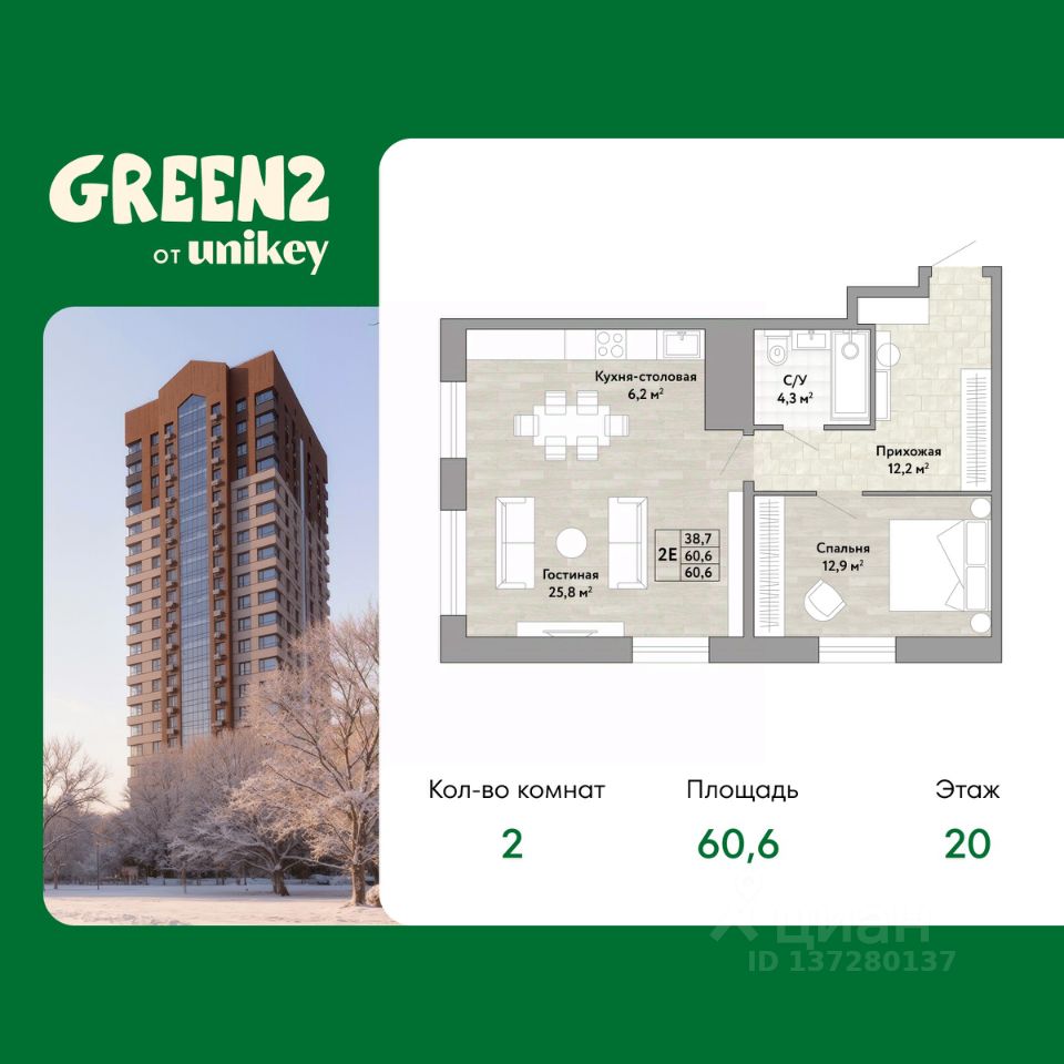 2-комн. квартира в ЖК "Green 2" на 20 этаже. Общая площадь: 60.6 кв.м. Высота потолков 2.7 м.