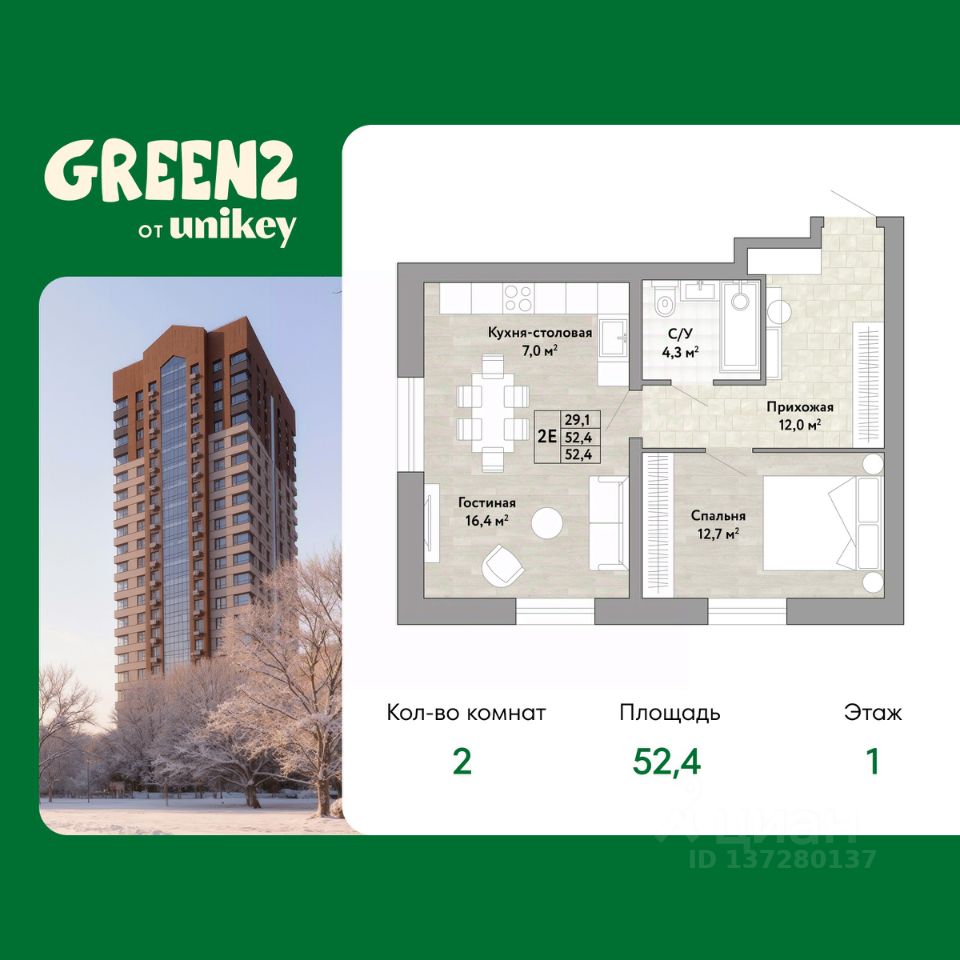 2-комн. квартира от застройщика в ЖК "Green 2" на 1 этаже. Общая площадь: 52.4 кв.м. Высота потолков 2.7 м.