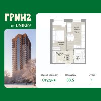 Однокомнатная квартира в ЖК "Грин 2" на 1 этаже. Квартира без отделки, после оформления собственности можно делать ремонт. Общая площадь: 38.5 кв.м., жилая: 12.1 кв.м., площадь просторной кухни-столовой: 14.5 кв.м. Все окна выходят на одну сторону. В квартире один совмещенный санузел. Высота потолков 2.7 м.