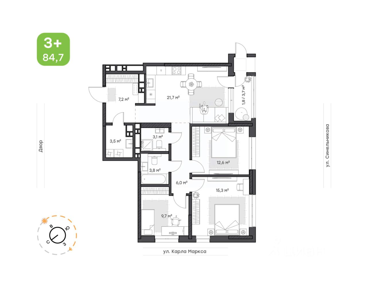 3,5-комнатная квартира для большой семьи с двумя детьми;