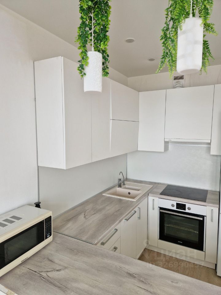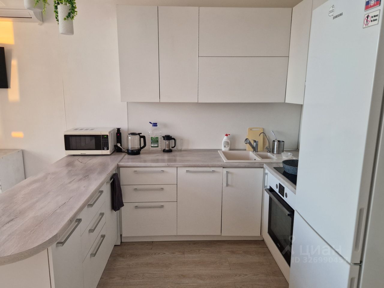 Кухня: кухонный гарнитур в сборе - большой холодильник, Стеклокерамическая плита, духовой шкаф, вытяжка, посудомоечная машина, микроволновая печь, чайник. Есть кондиционер, телевизор. Много зон хранения, остаются стулья. Есть место для дивана и дополнительной мебели.