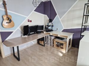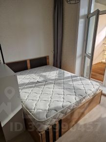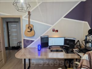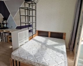 В основной комнате 2 зоны: рабочая и спальная. Рабочая зона - большой компьютерный стол, может использоваться как письменный стол, стеллажи. В спальной зоне остается двуспальная кровать с хорошим матрасом. Стена напротив кровати выведена и отштукатурена для использования как экран проектора. Проектор на стеллаже, к нему выведен HDMI-кабель от тумбы у стены. Таким образом можно подключить медиа-центр или Алису с HDMI и смотреть фильмы на стене, получая звук от этой же стены.