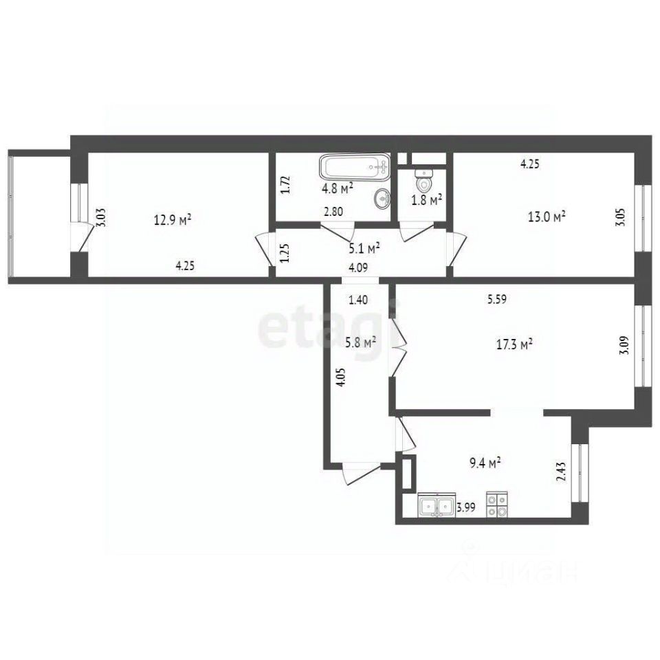 • Утепленная лоджия площадью 3 кв. метра, которая может быть использована как кабинет или дополнительное пространство для шкафов-купе.