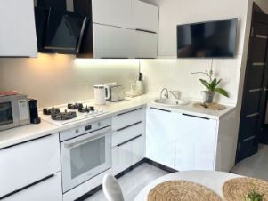 • Просторная кухня с встроенной мебелью и техникой, готовая к использованию.