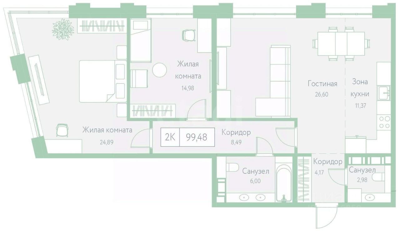 Квартира находится на этапе строительства — отличный шанс войти в проект на выгодных условиях. Площадь 99,48 м², две большие изолированные комнаты и просторная кухнягостиная создают гибкие возможности для планировки и удобного обустройства. Завершение строительства запланировано на 3 кв. 2026 — время подготовить интерьер и спланировать переезд заранее.
