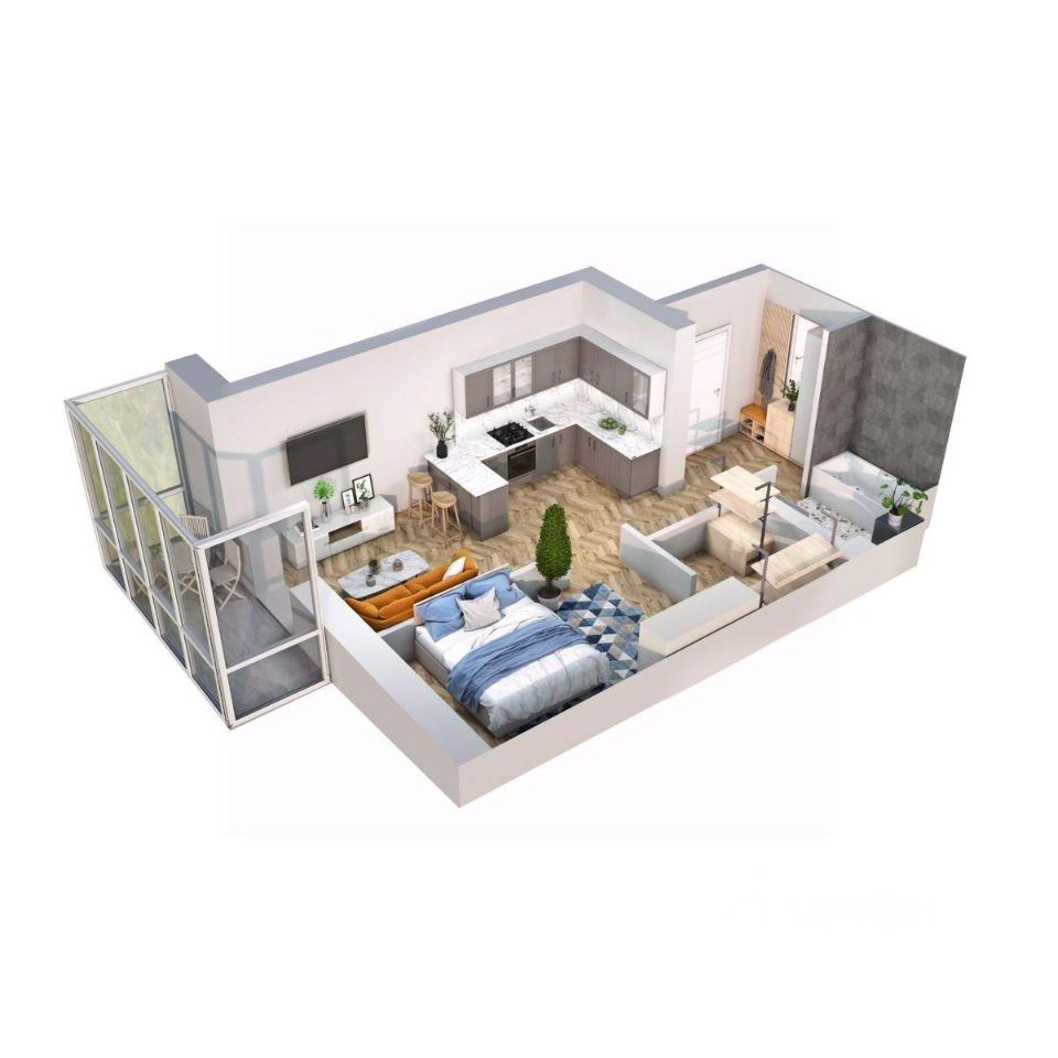Светлая и комфортная евродвушка 42 м². Здесь спальня, просторная кухня-гостиная, санузел и балкон с панорамным видом, который можно оборудовать как зону отдыха или рабочее место.