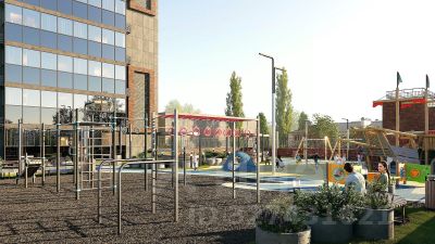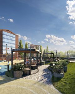 Безопасная зонированная площадка на стилобате, где много места для игр, спорта и спокойного отдыха.