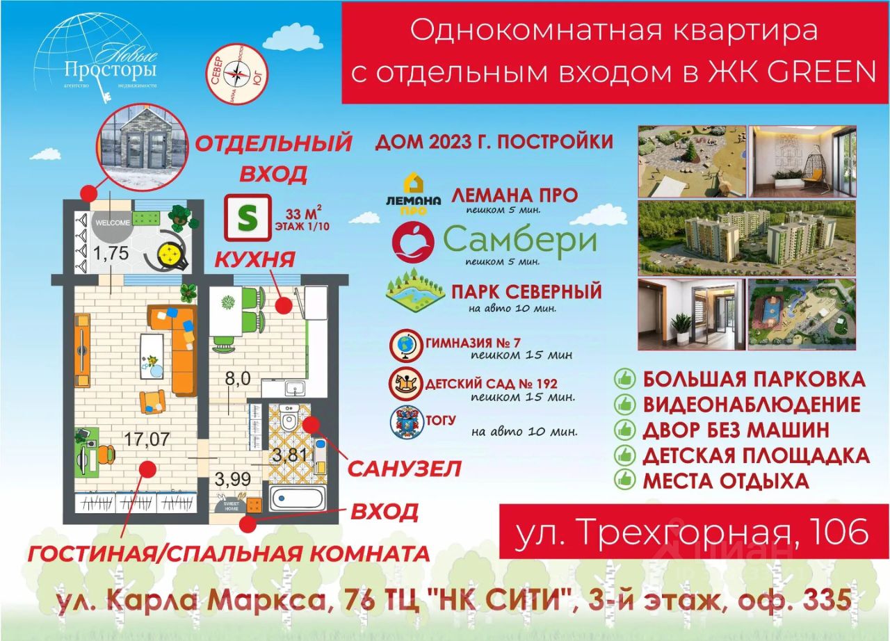 Представляем вашему вниманию отличную квартиру, расположенную в новом жилом комплексе в Северном микрорайоне. Район экологически чистый, динамично развивающийся. ЖК "Green" расположен на пересечении улиц Трёхгорная и Воронежская. Рядом с ЖК, в 10 минутах ходьбы Самбери и Леруа Мерлен Гимназия 7 и Детский сад 192 - 15 минут пешком и 5 минут на машине Тихоокеанский государственный университет - 10 минут на машине Парки культуры и отдыха - 10 минут на машине Закрытая территория с классной детской площадкой и местами отдыха для взрослых. Двор без машин. О квартире: 1 комнатная квартира, 33 кв.м., в квартире выполнен свежий ремонт, ламинат 33 класса, обои под покраску, в ванной стены и пол уложен керамогранит. Квартира укомплектована новой мебелью и техникой, заезжай и живи. При продаже остается всё, что вы видите на фотографиях. Главная фишка данной квартиры, это отдельный вход, очень удобно если у вас имеется собака, что избавит вас от встреч с соседями, у которых так же имеются собаки. Так же данное помещение можно использовать как кладовую и хранить там крупногабаритные вещи, такие как коляска, велосипеды, лыжи, доска для сноуборда и многое другое. Не упустите свою возможность в приобретении этого уникального объекта недвижимости, приобретая его, вы точно не прогадаете и удачно вложите свои деньги. Записывайтесь на просмотр. Услуги компании по приобретению объекта 50 000 рублей.