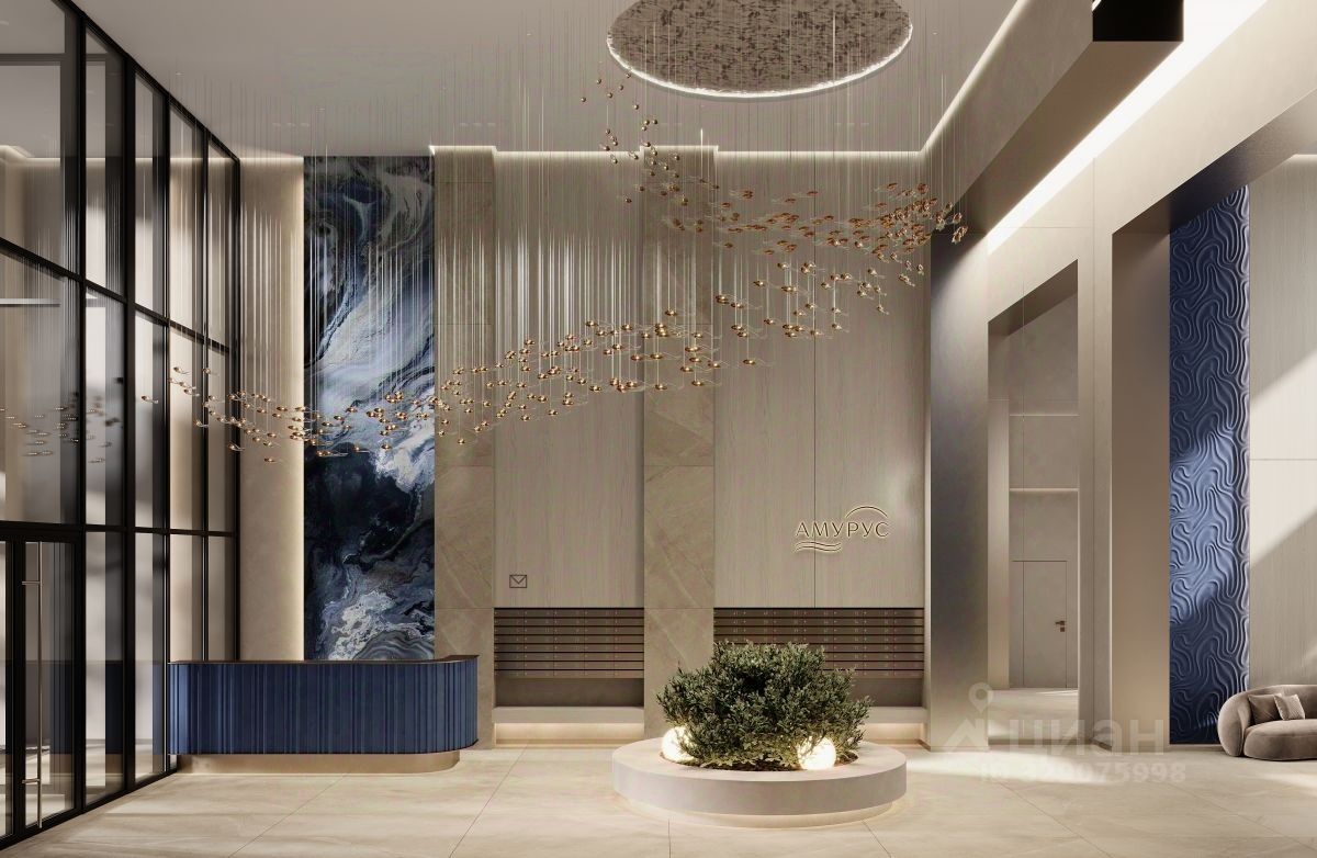 Входная группа в дом выполнена витражным остеклением из теплых алюминиевых профилей Шуко с заполнением двухкамерным стеклопакетом. Вы заходите в дизайнерский холл с высотой потолков 7 метров, где вас встречает консьерж. Здесь есть зона ожидания, гостевой санузел. Через холл можно попасть на закрытую дворовую территорию или пройти к лифтам. На скоростном лифте можно подняться на свой этаж, подземный паркинг или в лаундж зону для жителей ЖК - эксплуатируемую террасу на крыше, на которой можно любоваться видом на город, реку Амур и небо с высоты 70 метров.