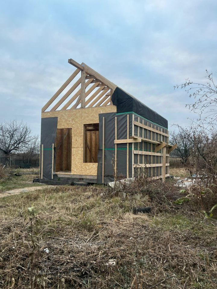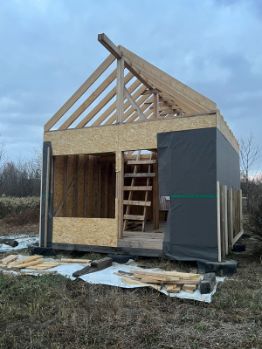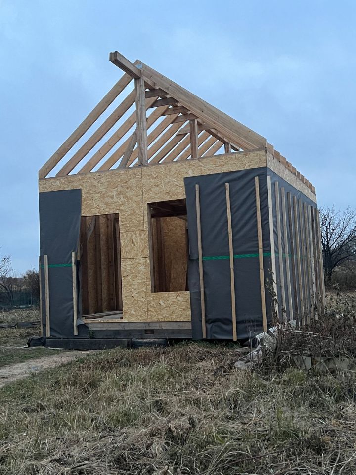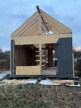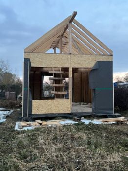 Готовый каркас: Возведены стены с усиленным шагом балок 59 см, специально рассчитанным под укладку рулонного утеплителя.