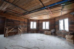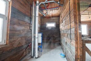 Баня расположена в пятнадцати метрах от дома. Размер 7х4,5 м, построена на капитальном фундаменте из ростверка, бревенчатая из осины, снаружи отделана блокхаусом из кедра, окна и двери также из кедра, внутренняя отделка выполнена из липы, печь металлическая титан, камни в парной с перекатов реки Си, район п. Мухен.