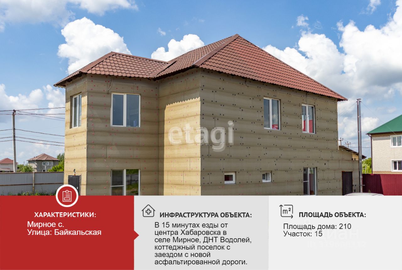Если любите роскошь, совмещенную с загородным уютом, то это ВАШ вариант! Шикарный коттедж в два этажа! Площадью 210 кв. м., четыре комнаты, 2017 года постройки, в 15 минутах езды от центра Хабаровска в в селе Мирное, ДНТ Водолей, коттеджный поселок с заездом с новой асфальтированной дороги. Коттедж продуман до мелочей, делалось для себя с душой, материалы отсева блок -утеплитель пеноплекс. На каждом этаже санузел и ванная комната, просторная кухня-гостиная, кабинет для работы, большие спальни и гардеробная, а также кладовые. Электричество 380 В 15 кВт. Вода привозная- ёмкость на 5 кубов. Септик 9 кубов. Тепло в доме от экономичного комбинированного котла электрический/ твёрдотопливный (платёж до 7 тыс. руб. зимой), по первому этажу тёплый пол, на втором этаже радиаторы отопления. После продажи остается почти вся мебель, бойлер на 120 литров и бытовая техника.