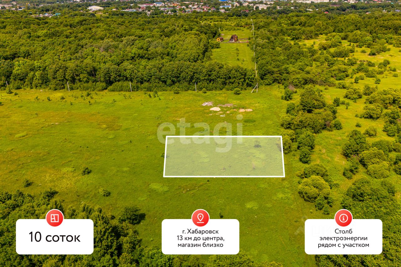 Земельный участок площадью 10 соток расположен в г. Хабаровск (возле с. Ильинка). Участок имеет правильную форму, что упрощает планировку и строительство, а отсутствие деревьев позволяет сразу приступить к освоению территории без дополнительных затрат на расчистку. Коммуникации доступны: электричество подведено вблизи участка, что сокращает расходы на подключение. Назначение земли — под индивидуальное жилищное строительство (ИЖС), что дает возможность возвести частный дом для постоянного проживания с последующей пропиской.