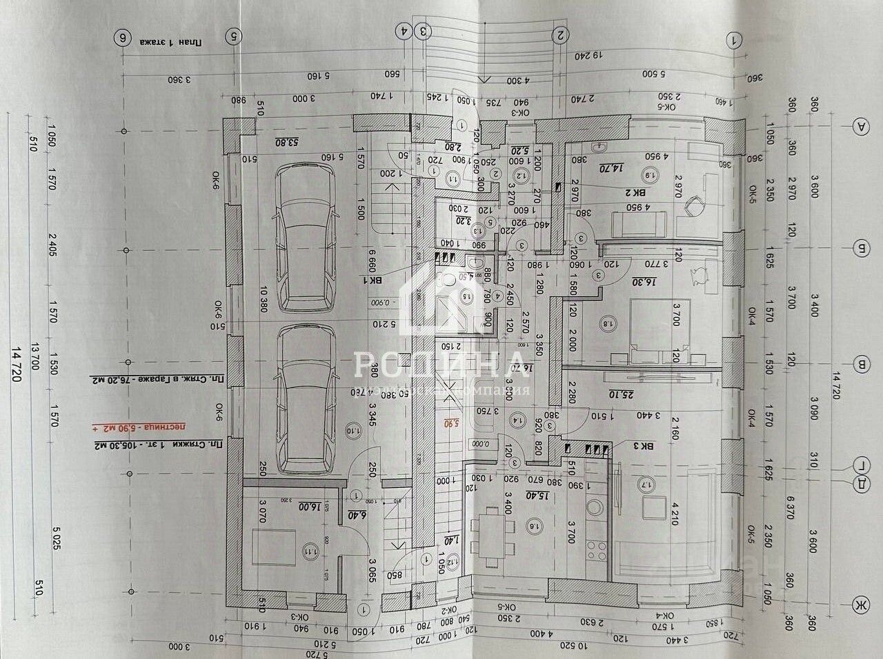 - 1 этаж - три комнаты: гостиная, две спальни, большая кухня, санузел, гардеробная и парадная.