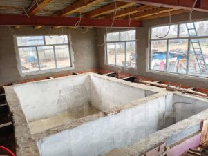 Фундамент - наливные бетонные сваи. Стены - арболитовые блоки, утеплитель, облицовочный кирпич. Перекрытия -бетонные плиты.