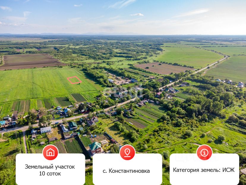 Земельный участок площадью 10 соток расположен в коттеджном поселке рядом с селом Константиновка. Категория земель — населенные пункты, разрешенное использование — ИЖС, что позволяет построить капитальный дом для круглогодичного проживания. Участок ровный, без перепадов высот, с четко обозначенными границами после межевания. Подъездные пути качественные, ограждение отсутствует, что дает свободу в планировке территории.