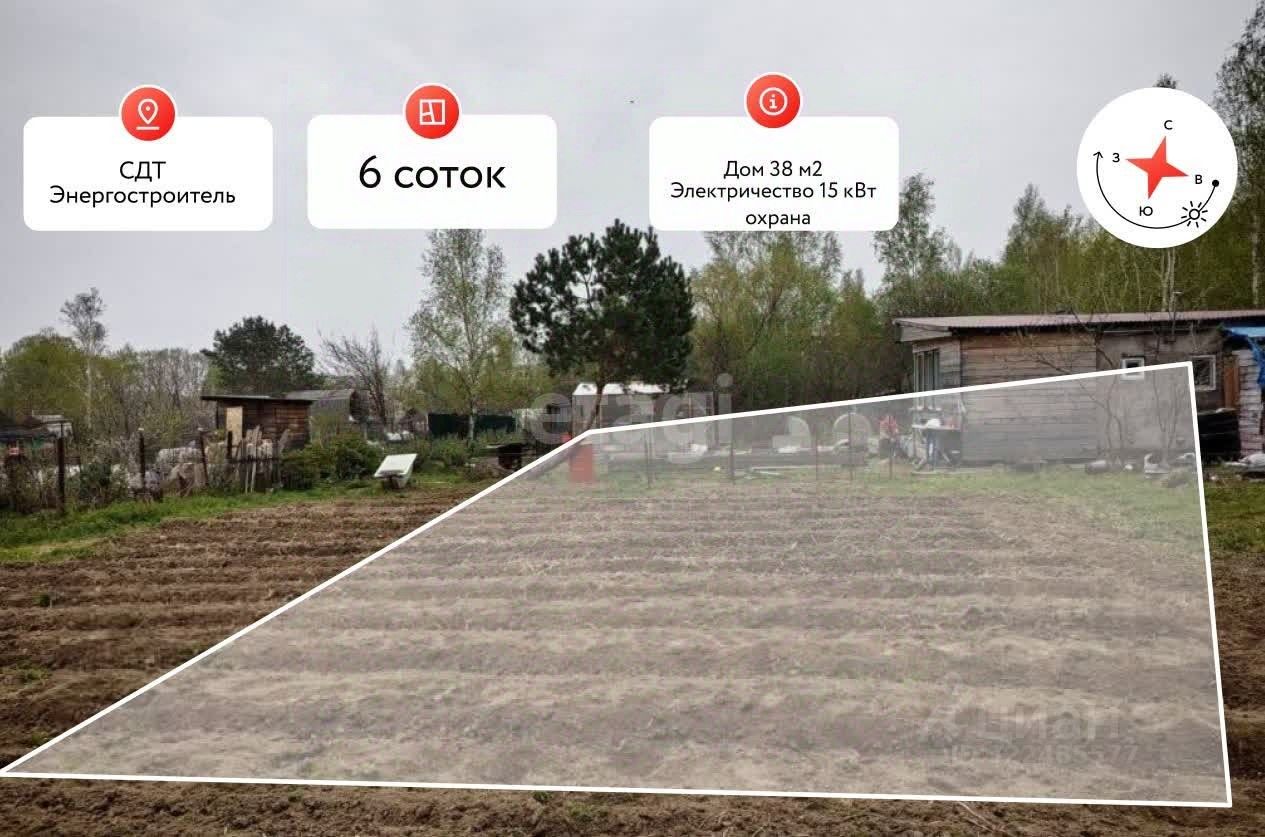 Земельный участок 2Х по 6 сот, в СНТ "Энергостроитель ". Заезд с двух сторон: Березовка, Полярная. Два поста охраны. Шлагбаумы с обеих сторон. 11 соток, домик с 2 комнатами, свет 380 V, 15 кВт, теплица, кладовая для инвентаря, баки для чистой воды 3 куба , подключенные к насосу. Вода с баков подаётся по всему участку. В домике есть туалет и небольшая ванна. На участке много ягодных кустов(смородина черная/красная, жимолость), слива, малина, клубника, ежевика, много грядок.