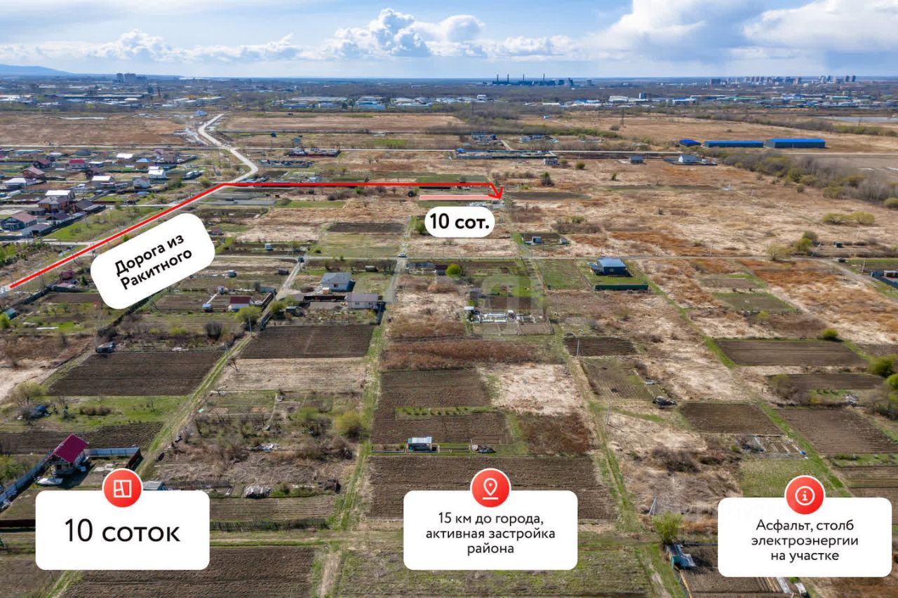Участок площадью 10 соток с ровным рельефом расположен в 60-м квартале села Ракитное, что обеспечивает легкую планировку и начало строительных работ без дополнительных затрат на выравнивание территории.