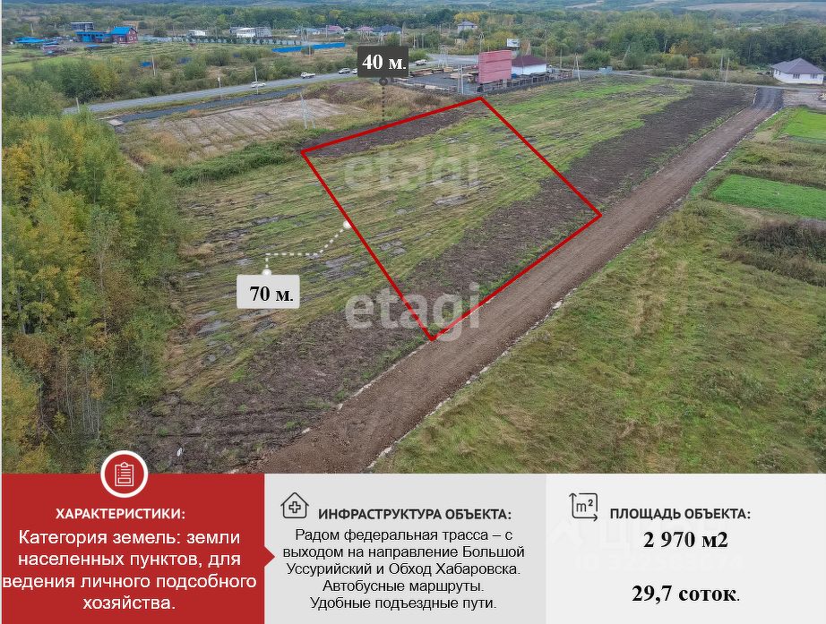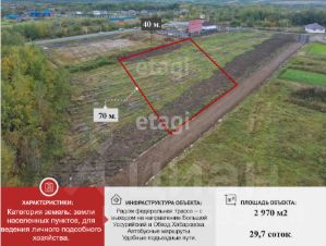 Категория земель: земли населенных пунктов, для ведения личного подсобного хозяйства. Радом федеральная трасса с выходом на направление Большой Уссурийский и Обход Хабаровска.